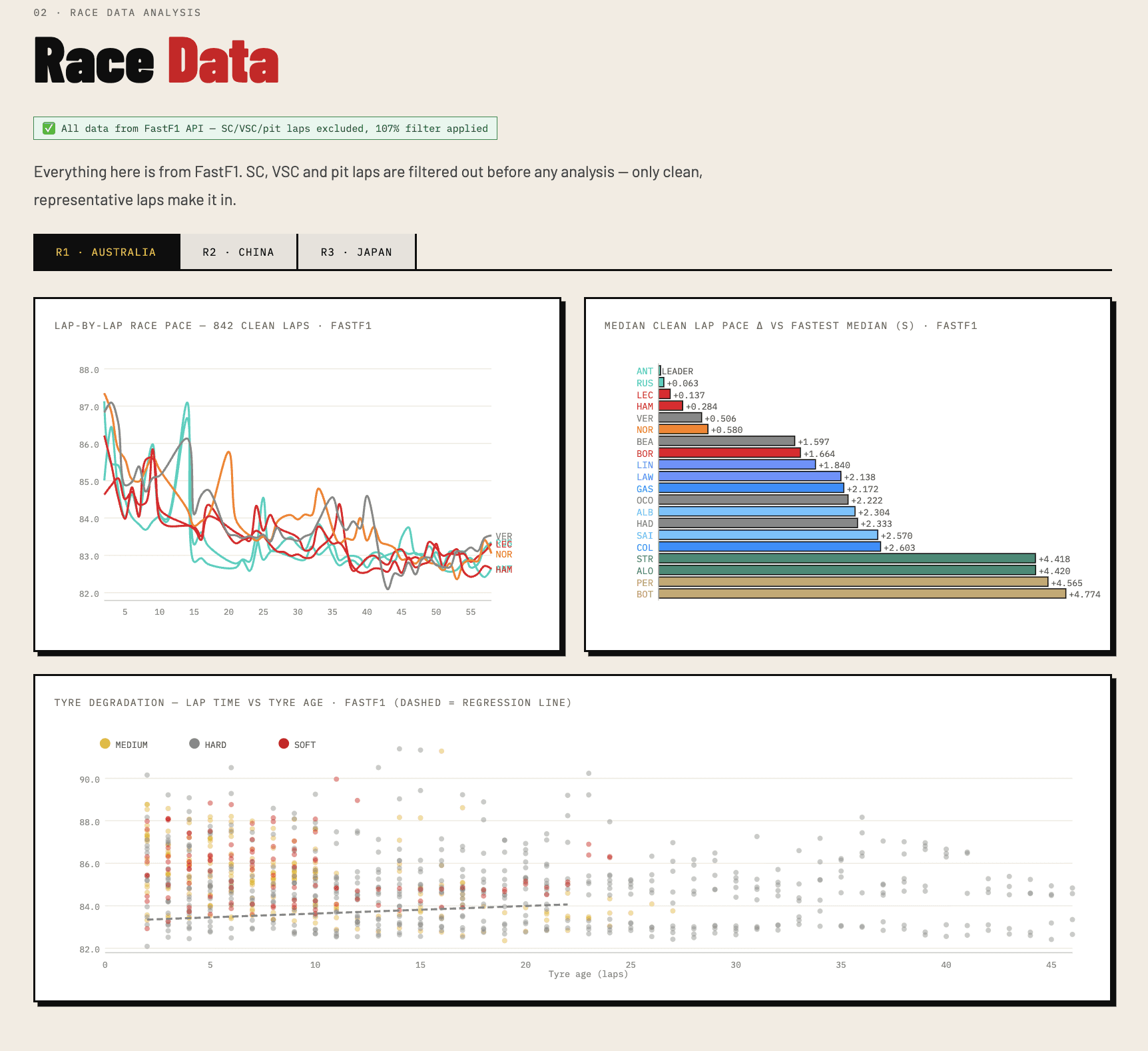 Everything in the race analysis section is directly from FastF1. Safety car laps, VSC periods and pit entry/exit laps are filtered out before any analysis. Sector deltas show each driver's best sector time minus the field best, averaged across all three rounds. Tyre degradation is a linear regression of lap time against tyre age, per driver per compound.