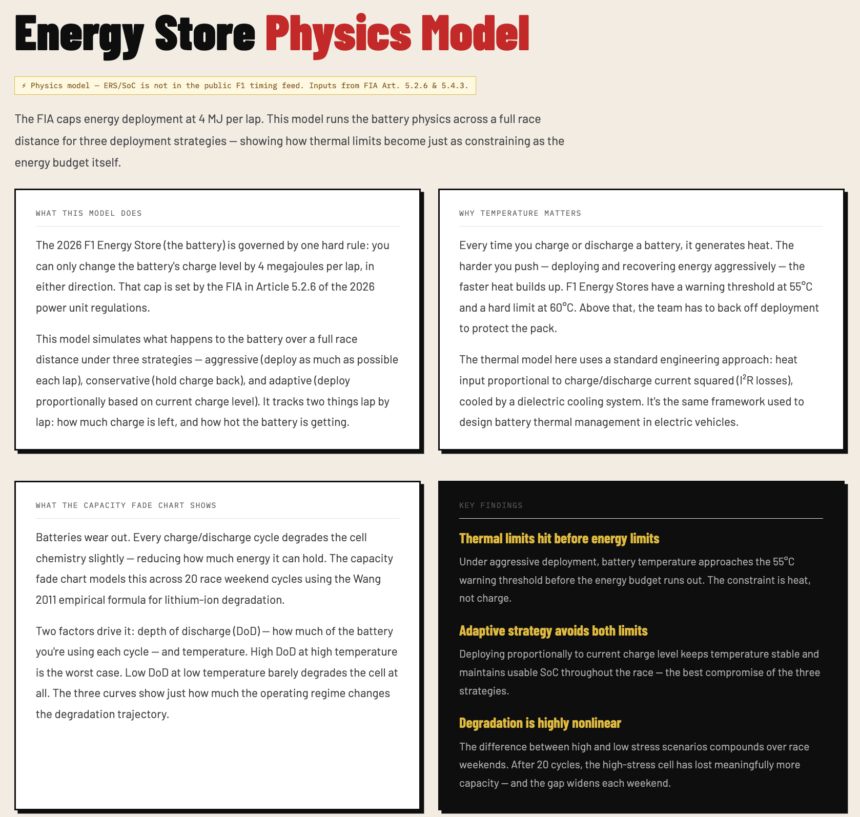 ERS and SoC data isn't in the public F1 timing feed, so I built a physics model using the FIA regulation constraints as inputs. The 4 MJ per lap SoC cap comes from Article 5.2.6 of the 2026 power unit regulations. The model runs three deployment strategies across a full race distance and tracks both charge level and temperature lap by lap using a lumped-parameter thermal model. The capacity fade curves use the Wang 2011 empirical formula for lithium-ion degradation.